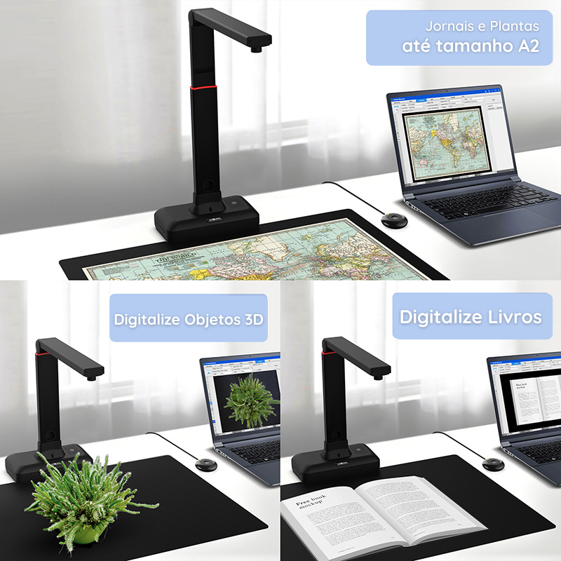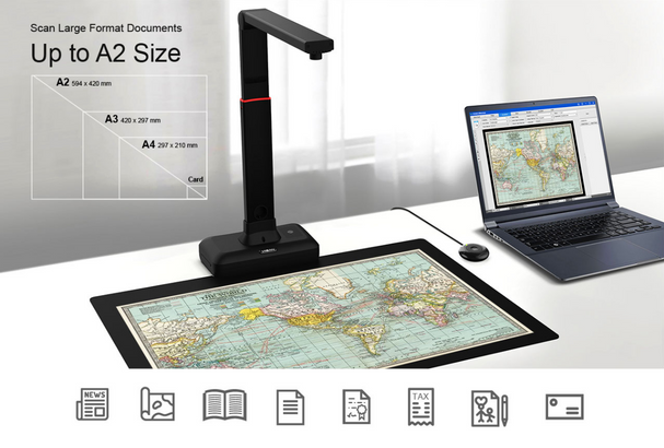 Digitalize todos os tipos de documentos de tamanho até A2. Especialmente os de grande formatos como jornais, mapas, periódicos, e livros.